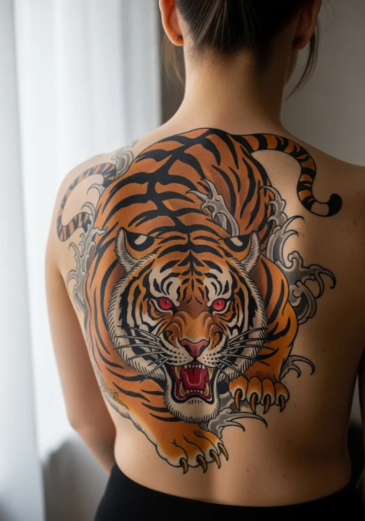 This breathtaking full-back tattoo shows a tiger mid-pounce, its body stretched across the shoulder blades. The orange and black stripes curve perfectly with the natural lines of the back, while the eyes burn with an intense red glow that instantly catches attention.