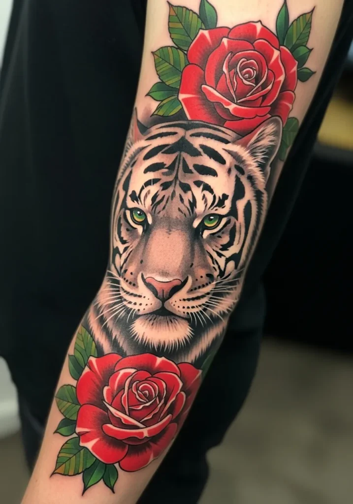 This arm tattoo showcases a white tiger surrounded by two large red roses. The mix of white, black, and red creates a stunning contrast that feels both regal and fierce. The tiger s calm gaze and the rich floral detail give it a refined, feminine touch.