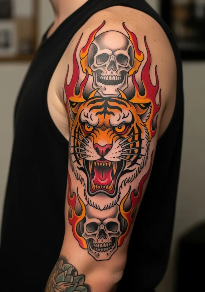 This fiery American Traditional tattoo takes up the entire upper arm, featuring a roaring tiger head surrounded by bright red and orange flames. Two detailed skulls sit above and below the tiger, creating a dramatic composition that instantly catches the eye. The bold black outlines and solid color fills make it look powerful and timeless.