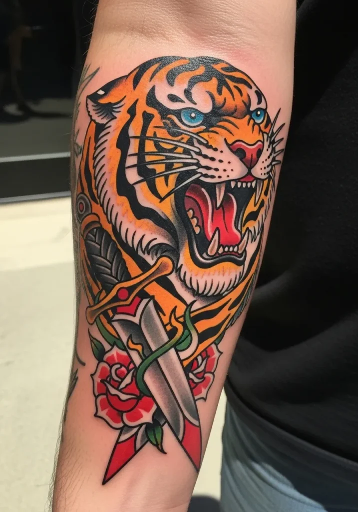 This arm tattoo mixes classic American Traditional style with fierce symbolism. The tiger s open mouth is paired with a dagger piercing through, surrounded by red roses and green leaves. The thick black outlines and bold color blocking make every element pop under sunlight.
