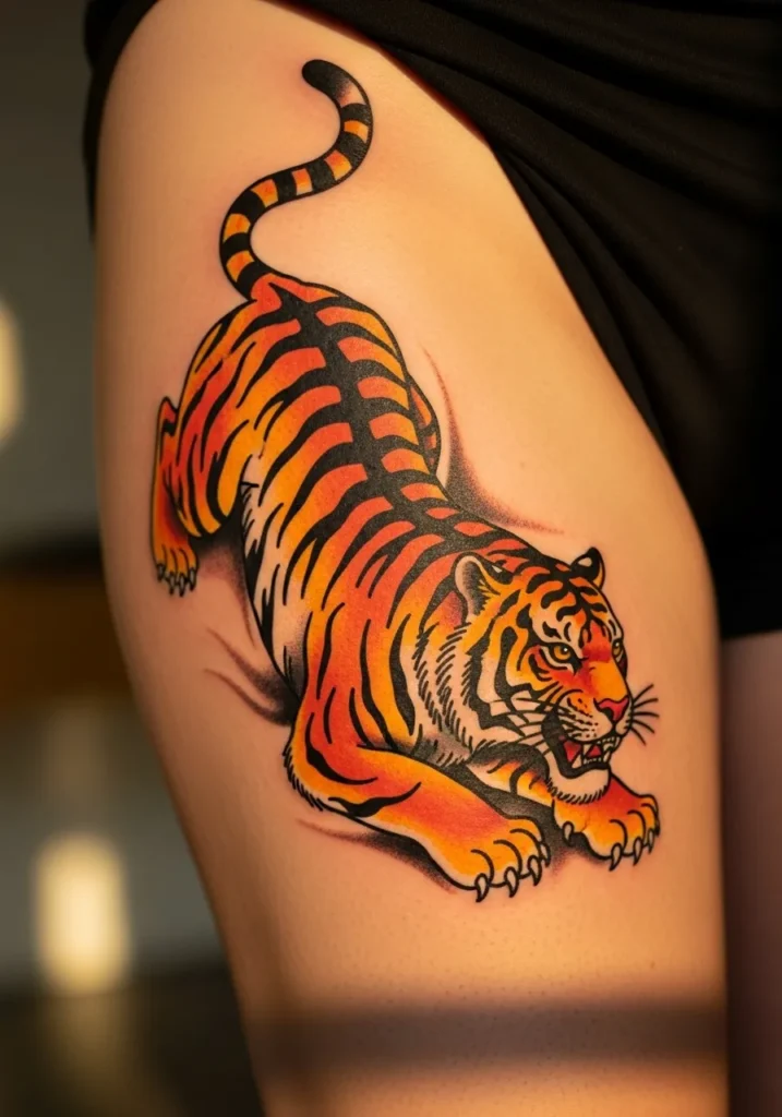 This tattoo shows a crouching tiger on the thigh, ready to pounce. The smooth gradient of orange to yellow with bold black stripes gives it a lively glow, while the posture adds a touch of motion and energy. It s perfectly placed to follow the natural curve of the leg.