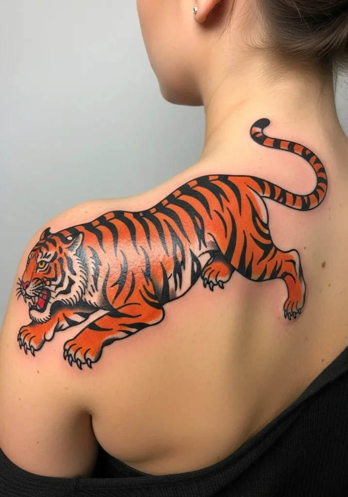 This tattoo sits perfectly across the upper back and shoulder, featuring a crouching tiger in vivid orange and black ink. The clean outlines and solid color fill make it unmistakably American Traditional, and the pose adds a fierce sense of motion.