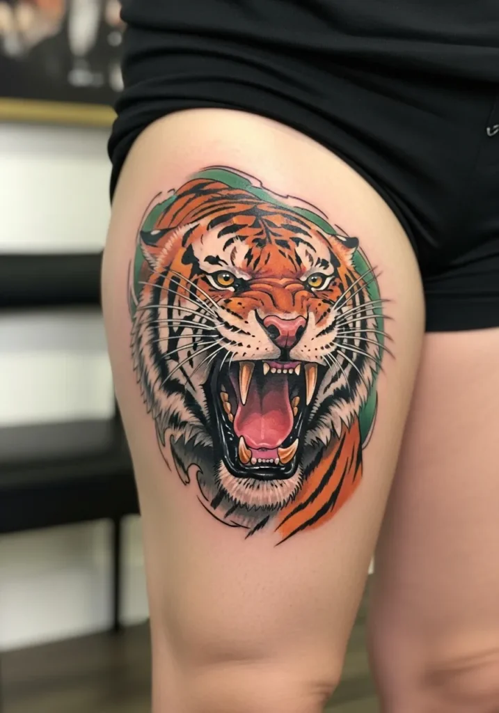 This bold American Traditional tattoo shows a roaring tiger head inked on the upper thigh. The piece is medium-to-large in size, filled with vivid oranges and deep blacks that highlight every stripe. You can see the detailed whiskers and sharp teeth framed by soft shading and clean outlines that make the tiger look alive against the skin.