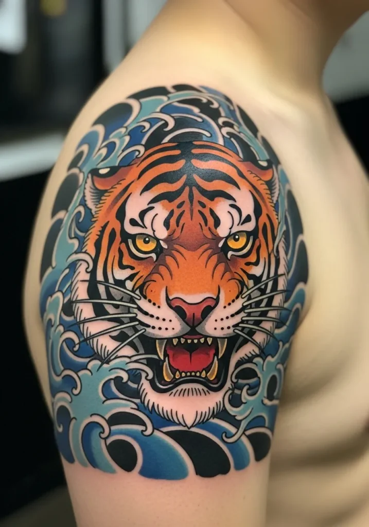 This shoulder tattoo captures a roaring tiger surrounded by swirling ocean waves in bold American Traditional style. The deep blue tones of the waves frame the tiger s vivid orange fur perfectly, creating an eye-catching contrast. The placement hugs the curve of the shoulder, and the clean lines give it that classic, timeless feel.