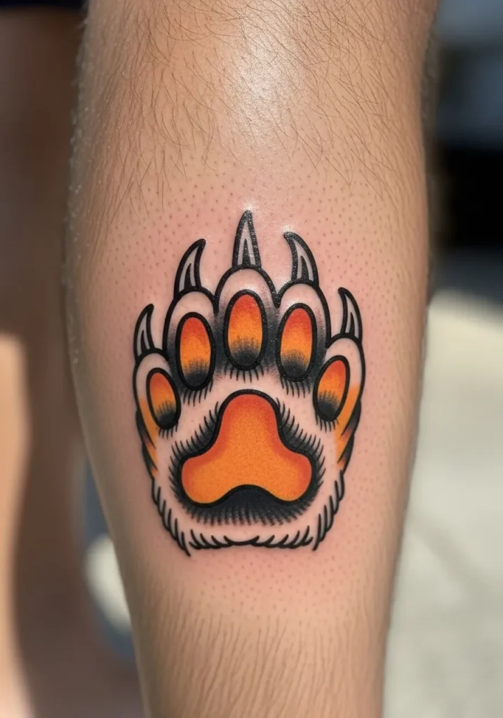 This playful American Traditional tiger paw tattoo sits neatly on the calf. The design keeps things simple but bold, with clean black outlines and warm orange gradients that make the paw look iconic. The sharp claws add a hint of wildness without overcomplicating the piece.