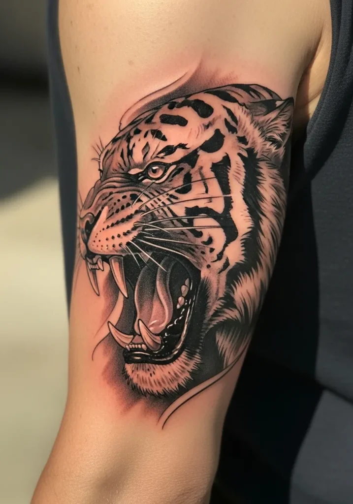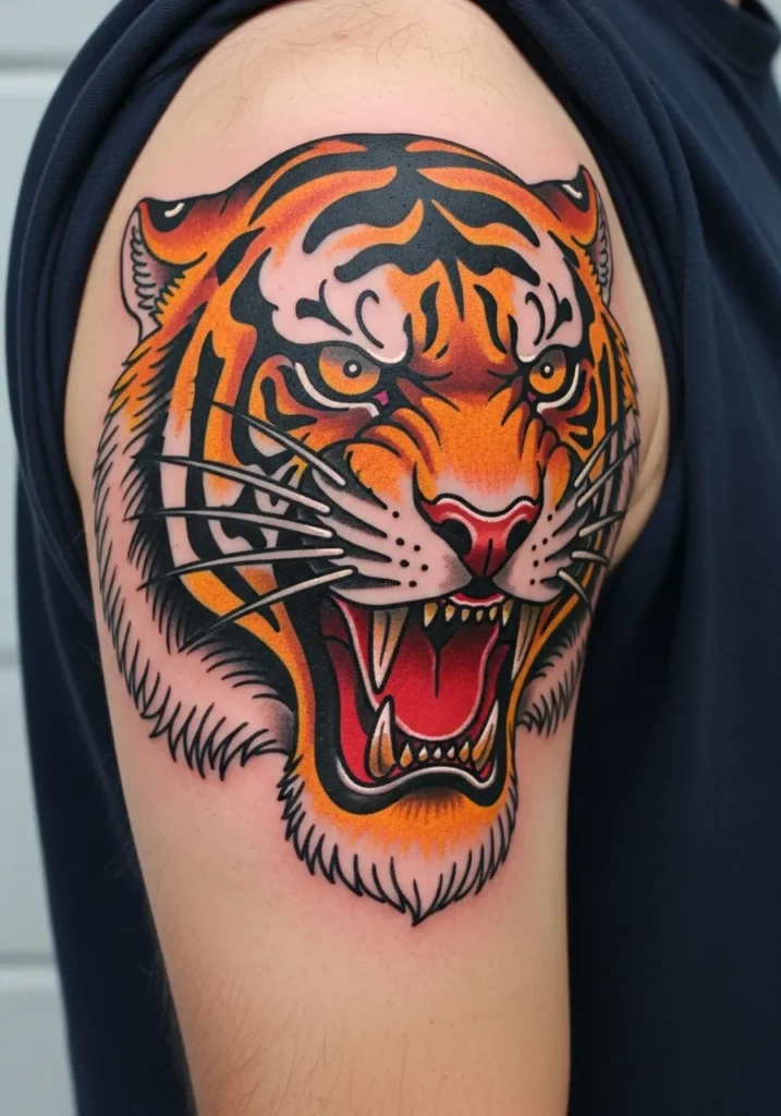 This upper-arm tattoo captures the essence of American Traditional style. The tiger s bold stripes, open mouth, and blazing orange fur are outlined with perfect precision. The placement on the shoulder makes it stand out with every movement.