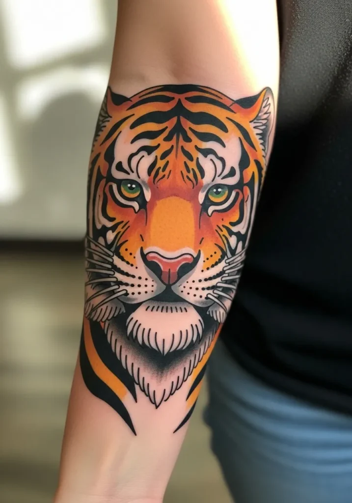 This forearm tattoo focuses on a powerful tiger head with bright orange fur and piercing green eyes. The bold lines and smooth shading capture everything people love about American Traditional art. It sits perfectly on the forearm, making it a showstopper every time the arm moves.