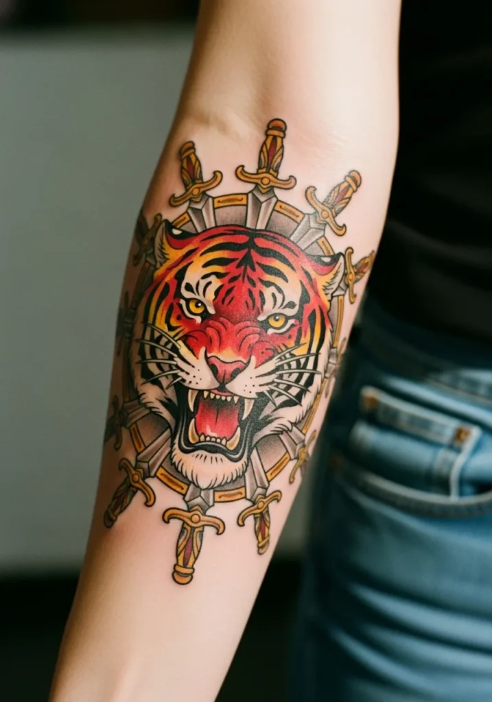 This forearm tattoo shows a fierce tiger head surrounded by a ring of small swords. The deep reds, yellows, and blacks pop vividly in classic American Traditional style. The layout is symmetrical and perfectly placed to complement the arm s shape.