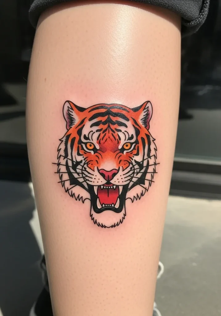 This small yet striking tiger head tattoo sits cleanly on the lower leg. The vivid orange tones, bright eyes, and sharp black outlines make it pop perfectly against the skin. It s minimal but still full of character, capturing the fearless look of the tiger in a simple, classic way.