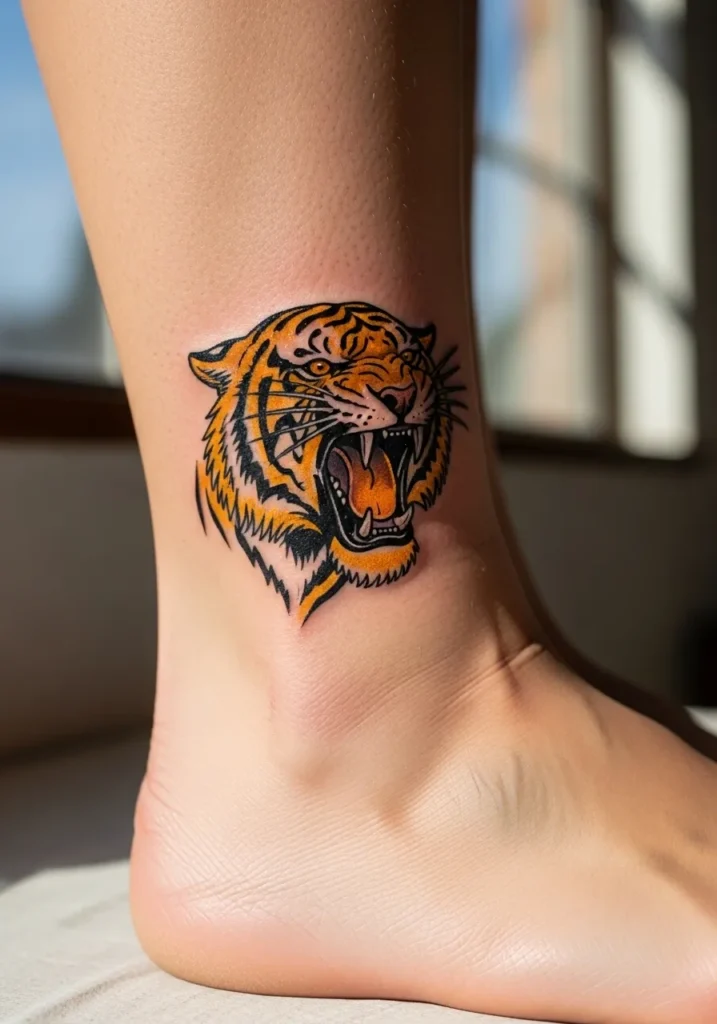 This small tiger head tattoo on the ankle may be tiny, but it packs a punch. With bright orange fur, sharp black stripes, and that unmistakable snarl, it s a perfect example of boldness in a compact size. The clean lines and crisp contrast make it pop beautifully against the skin.