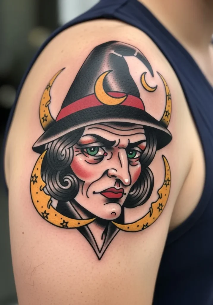 This bold American traditional witch tattoo sits perfectly on the shoulder, featuring a fierce witch s face framed by golden crescent moons sprinkled with stars. Her piercing green eyes and deep red lips contrast beautifully against the dark hat and its crimson band. The clean black shading and warm yellow tones give this piece a powerful, vintage look that feels straight out of a classic storybook.