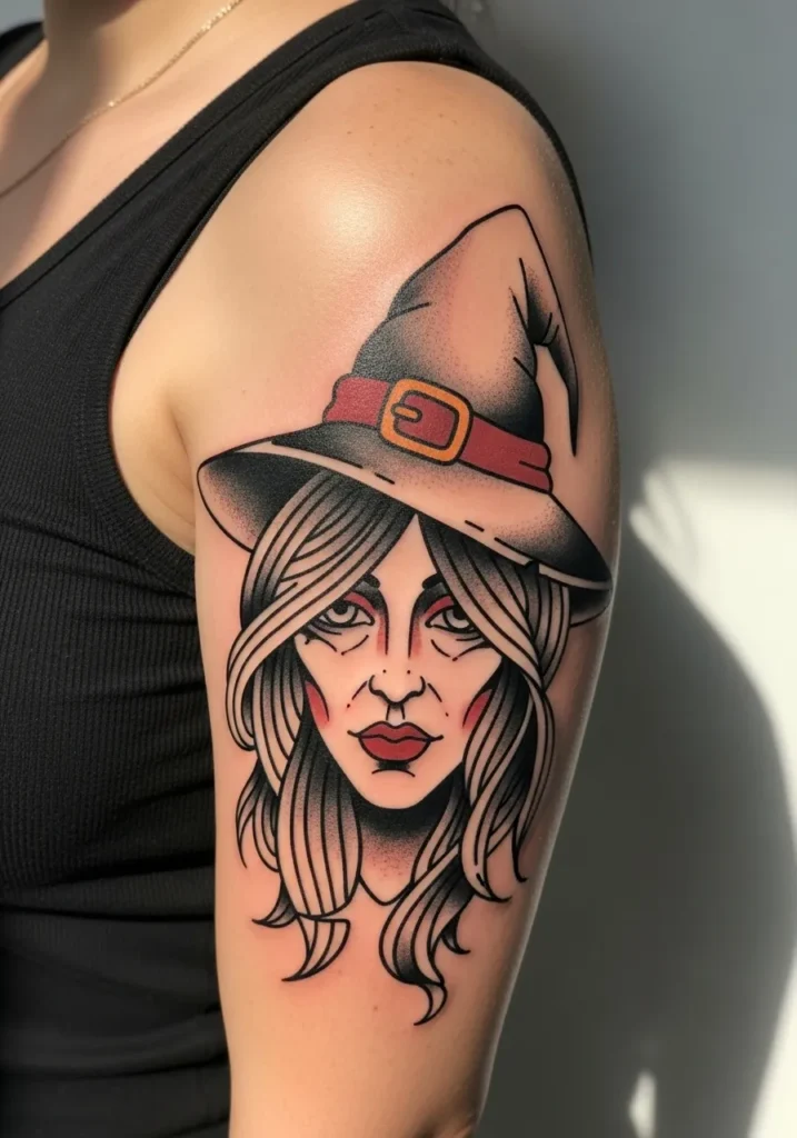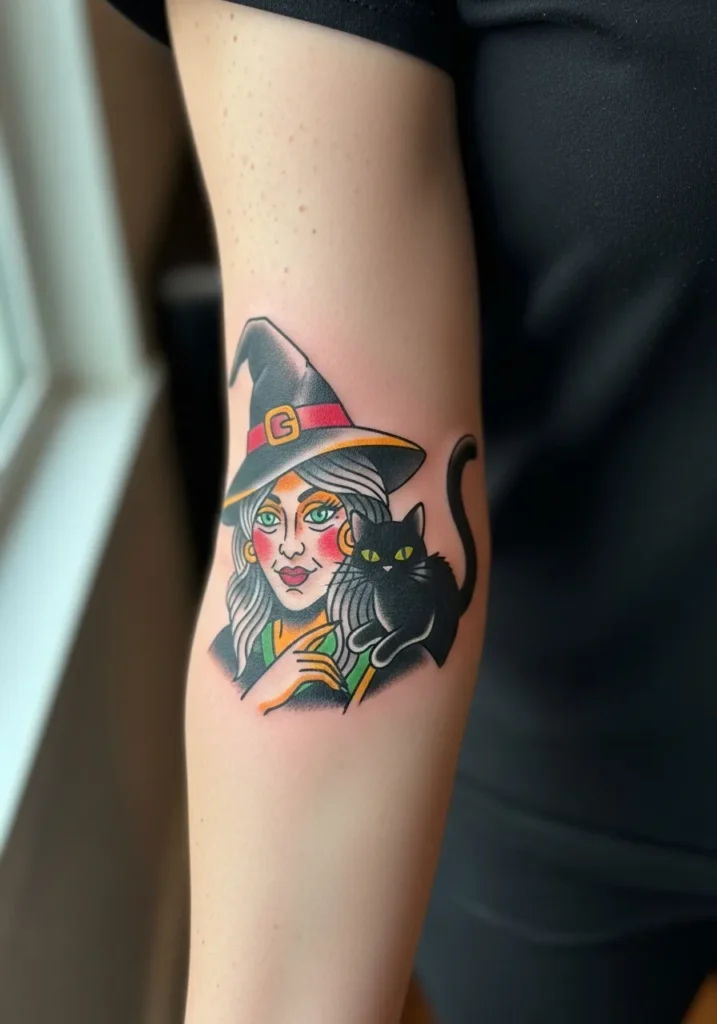 Placed on the upper arm, this medium-sized tattoo shows a witch with piercing green eyes and silver hair under her pointed hat, while a black cat rests confidently on her shoulder. The design uses solid lines and rich tones of gold, red, and black, giving it that signature traditional tattoo look.