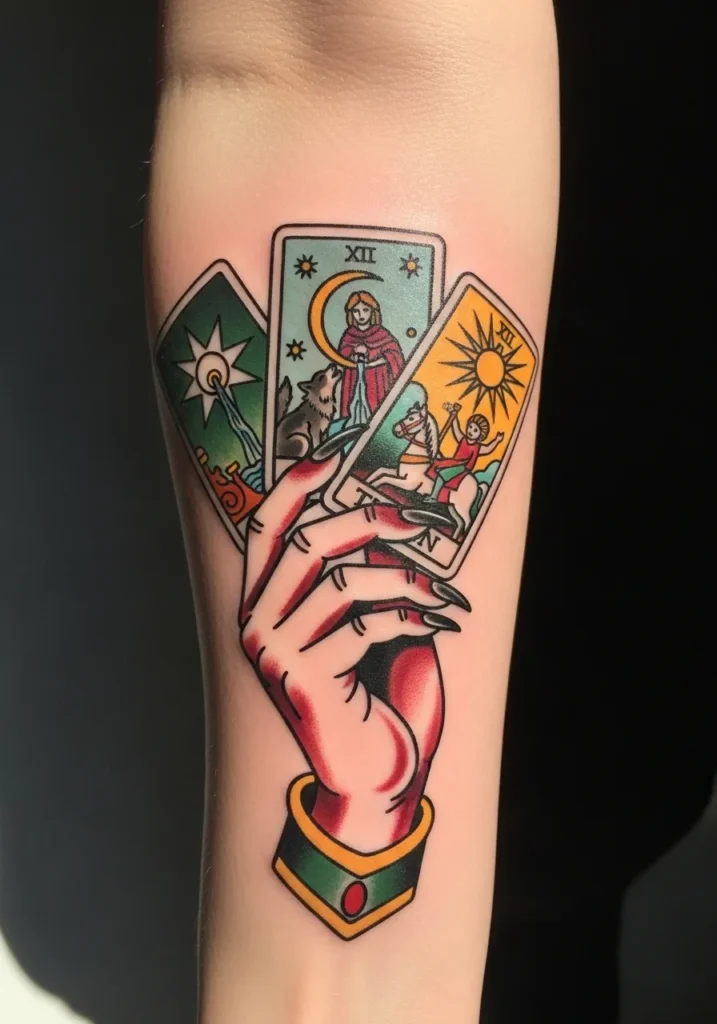 This forearm tattoo features a hand holding three tarot cards, each illustrated in bold colors green, gold, and orange with a moon and star motif. The long nails, jeweled bracelet, and crisp outlines make the design stylishly witchy without being overdone.