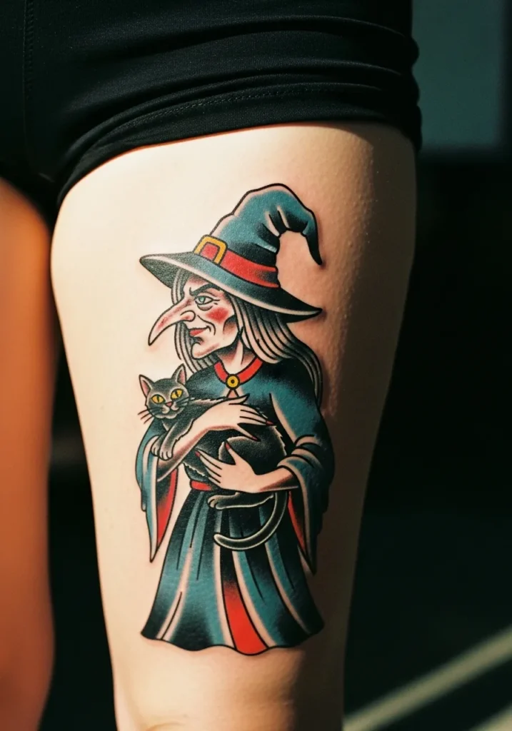 This vintage-inspired witch tattoo makes such a statement on the thigh. It features an old-school depiction of a witch holding her black cat, drawn in traditional bold lines with deep blacks, fiery reds, and subtle gradients that add so much depth. The tall pointed hat, hooked nose, and piercing eyes give off strong old Hollywood Halloween vibes, but in the best nostalgic way.
