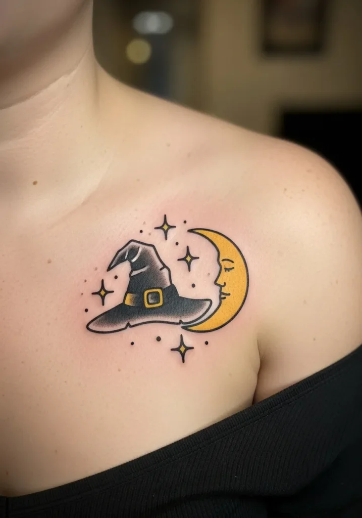 Placed near the collarbone, this small tattoo features a witch hat resting beside a smiling crescent moon, surrounded by tiny twinkling stars. The black and yellow color palette is simple but so effective, and the clean outlines give it that perfect American traditional crispness.