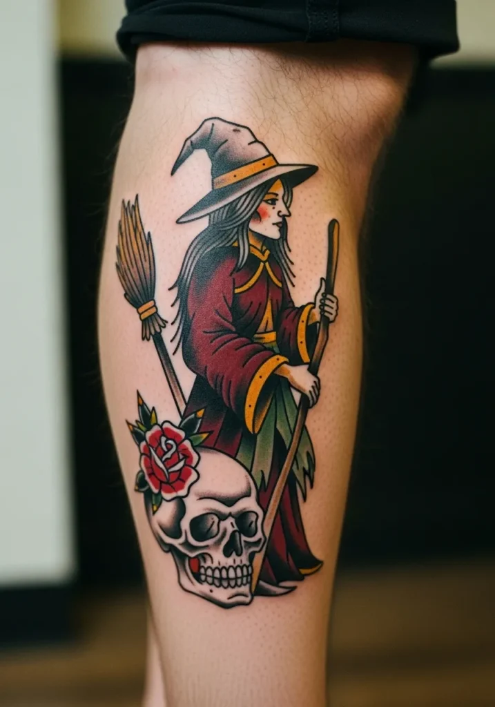 This leg tattoo shows a standing witch in a maroon robe holding her broom beside a skull decorated with a bright red rose. The bold black outlines, deep shading, and golden highlights make the design pop beautifully on the skin. It s a medium-sized piece that feels perfectly balanced between dark and elegant, showing off the traditional tattoo style with solid color blocks and clean linework.