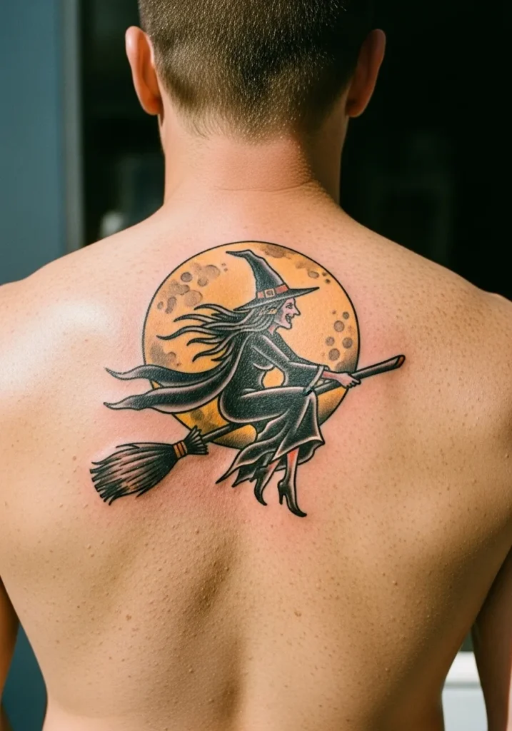 This striking back tattoo captures a classic witch silhouette soaring across a glowing full moon. The piece is large and perfectly centered between the shoulder blades, rendered in bold black outlines and warm shades of orange and yellow. The traditional style gives it that timeless flash-art charm, with clean shading and perfect contrast that makes it look straight from a vintage tattoo book.
