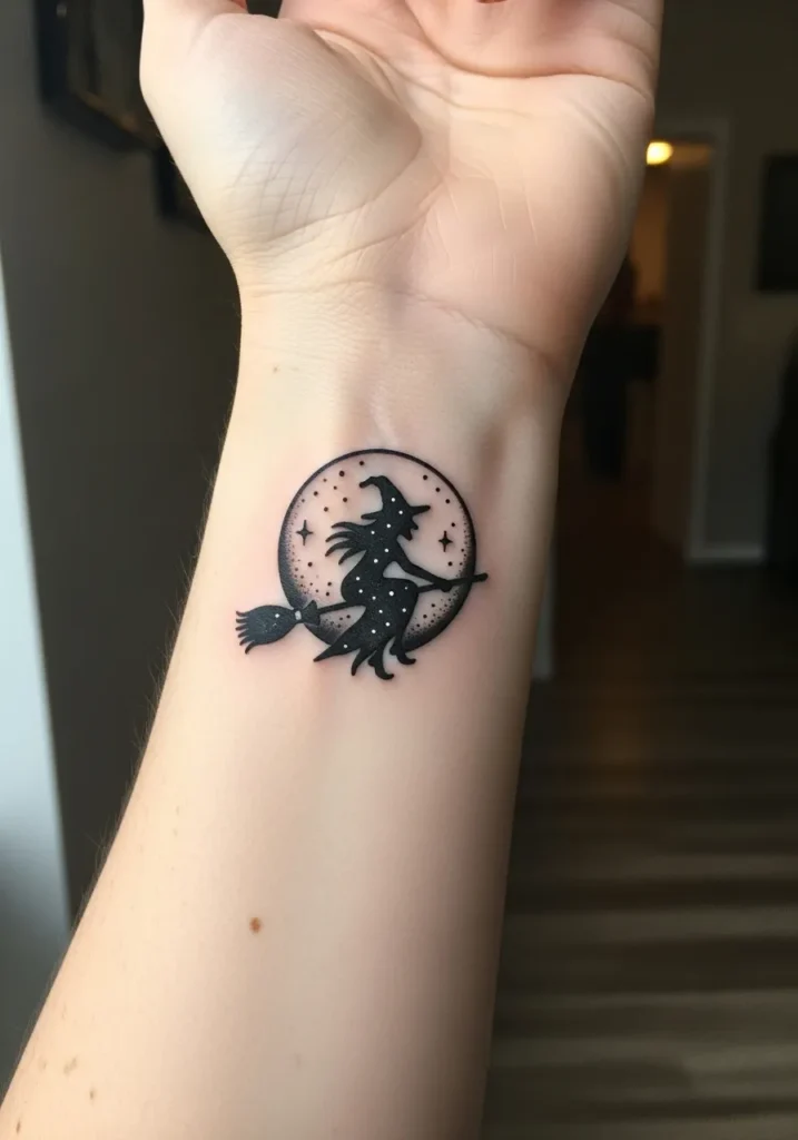 This small wrist tattoo shows a witch flying across a full moon, rendered entirely in black ink with delicate white dots for stars. The design is minimal yet striking, fitting neatly on the inner wrist and balancing negative space with precise detailing. The silhouette style gives it a mysterious, storybook look that feels timeless.