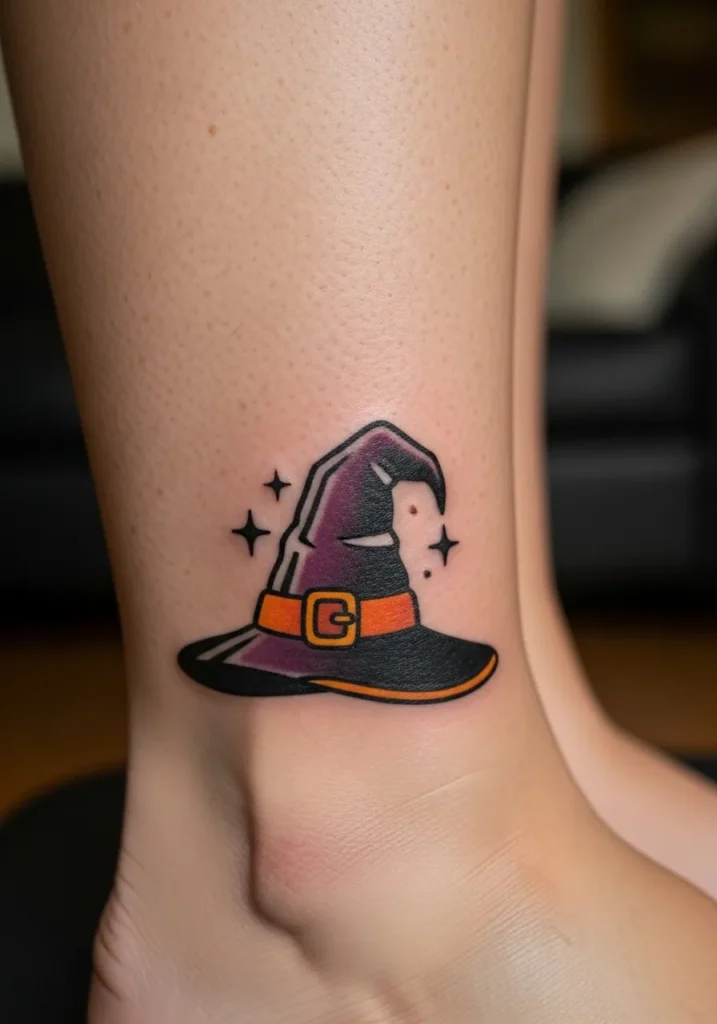 This tiny ankle tattoo features a perfectly shaded witch hat in deep black and purple tones, accented by an orange buckle and surrounded by subtle sparkling stars. It s a small design with crisp outlines and smooth color saturation, classic to the American traditional look but with a softer, cuter twist.