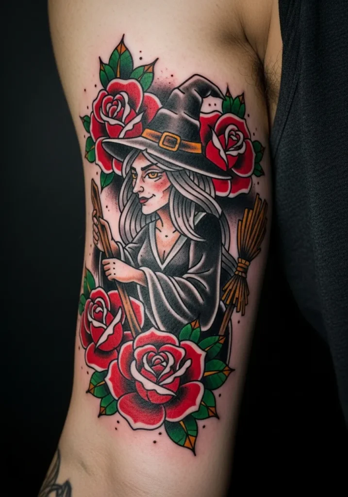 This American traditional witch tattoo looks absolutely stunning on the upper arm. The design features a mysterious witch with flowing silver hair, dressed in classic black robes and a pointed hat, framed by bold red roses with rich green leaves. The crisp black outlines and the deep shading bring a perfect balance of vintage charm and modern boldness. It s the kind of tattoo that commands attention without saying a word.