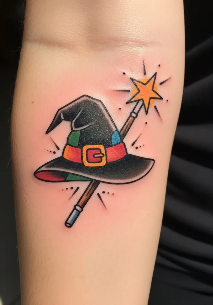 This small American traditional tattoo of a witch hat paired with a magic wand is pure charm. The design keeps it simple yet bold, with crisp black outlines, a pop of color on the band, and a golden star at the wand s tip. It s perfectly placed on the inner arm, making it a fun little nod to the magical side of life without being over the top.