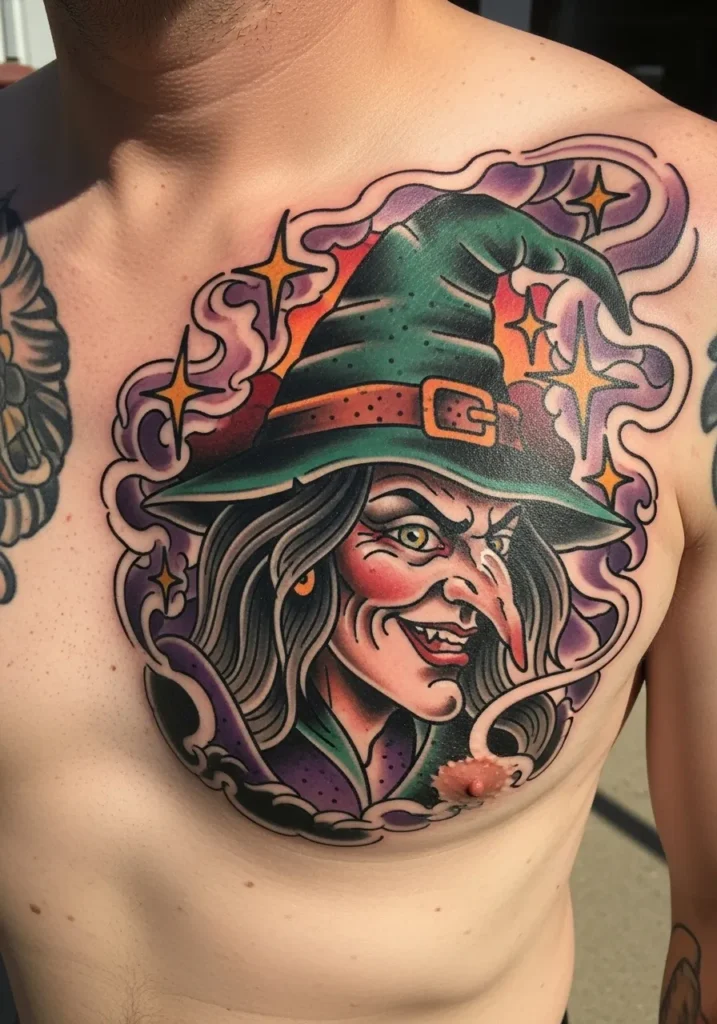 This bold chest piece shows a grinning witch in a large green hat surrounded by purple smoke and orange sparkles. It s big, detailed, and beautifully saturated everything about it screams confidence and vintage flair. The crisp lines and rich color gradients make it a perfect example of traditional tattoo craftsmanship.