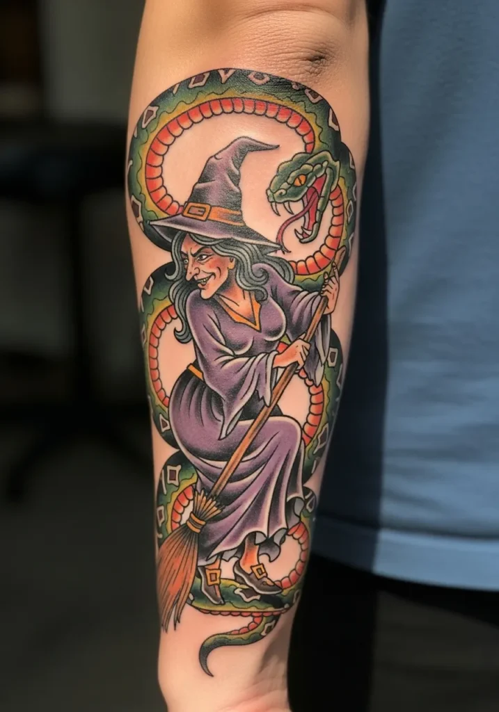 This forearm tattoo shows a fierce witch in a purple dress flying on her broom while a large green-and-orange snake coils around her. The detailed scales, flowing hair, and confident expression give this design serious energy. It s a bold and vibrant piece that captures the essence of classic tattoo storytelling.