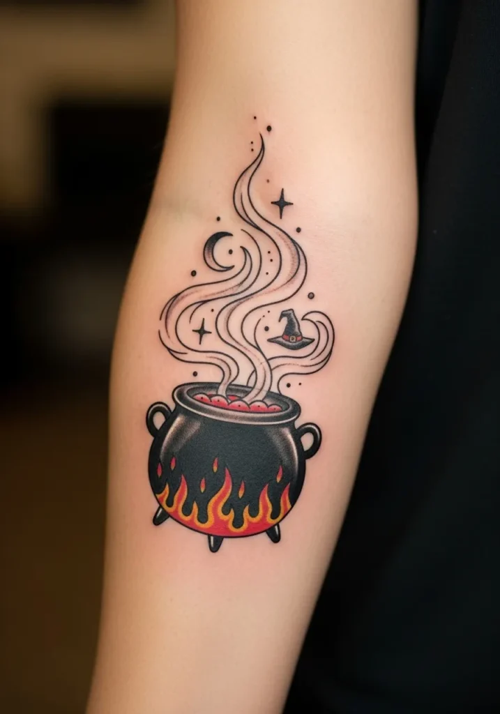 A bubbling black cauldron surrounded by fire and magical steam decorates the back of the arm in this tattoo. The steam curls upward, forming small stars, moons, and even a floating witch hat. The bold blacks and fiery oranges keep it true to the American traditional style, while the playful details make it unforgettable.