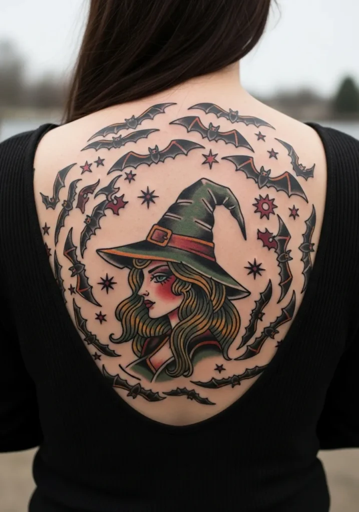 This large back tattoo features a stunning witch portrait in the center, framed by swirling bats and tiny stars. Her green hat and flowing blonde hair are shaded with warm tones that contrast beautifully with the black bats circling around her. The piece covers most of the upper back, giving it a bold and mesmerizing layout that draws the eye from every angle.