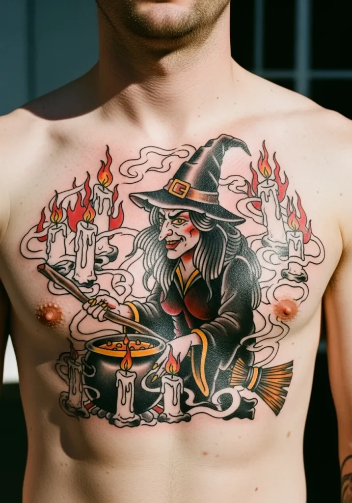 This dramatic chest tattoo features a witch stirring her cauldron surrounded by tall, flaming candles and swirling smoke. Her pointed hat, flowing robes, and the fiery details make this design come alive across the chest. The mix of warm yellows, deep blacks, and subtle shading creates an unforgettable piece of old-school witch art.