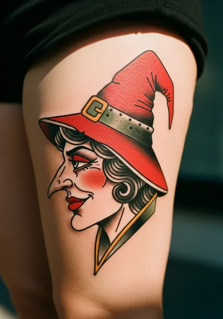 This thigh tattoo captures a witch s profile with flawless traditional lines, red blush, and a deep red hat with a green band. The strong shading gives her face a vintage pin-up vibe, while the sharp outlines make every detail crisp and defined.