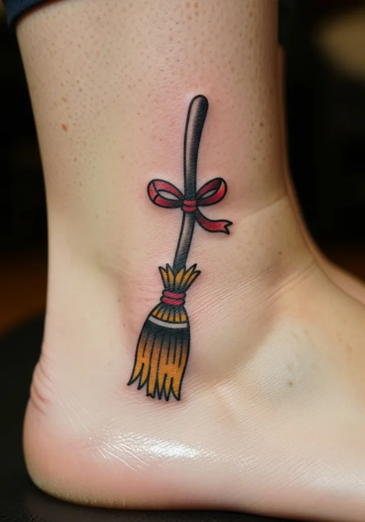 This tiny ankle tattoo features a simple broomstick tied with a small red ribbon. The clean lines, warm orange tones, and minimalistic composition make it a perfect piece for anyone who loves understated witchy symbols. Despite its size, the detail work is crisp and charming.
