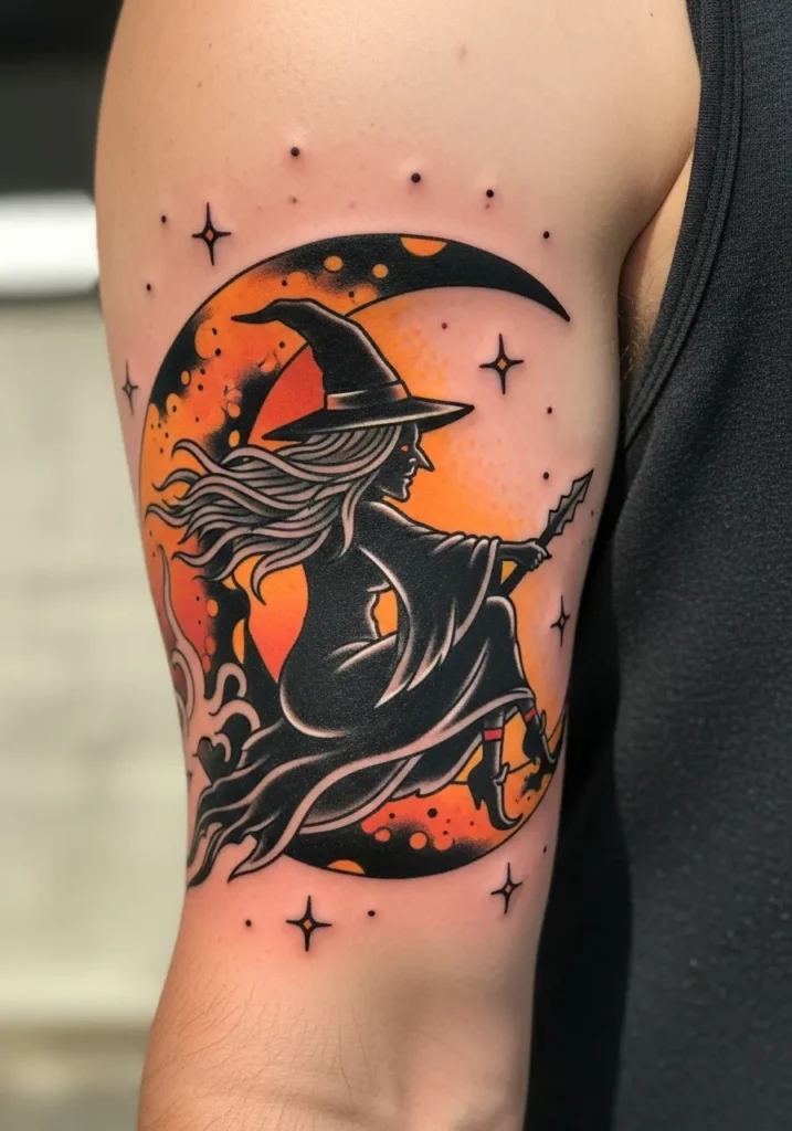This upper arm tattoo shows a witch flying past a glowing orange crescent moon, surrounded by small twinkling stars. The black and orange palette is classic, but the smooth gradients and clean linework make it stand out. It s medium-sized and perfectly balanced, sitting beautifully on the upper arm.