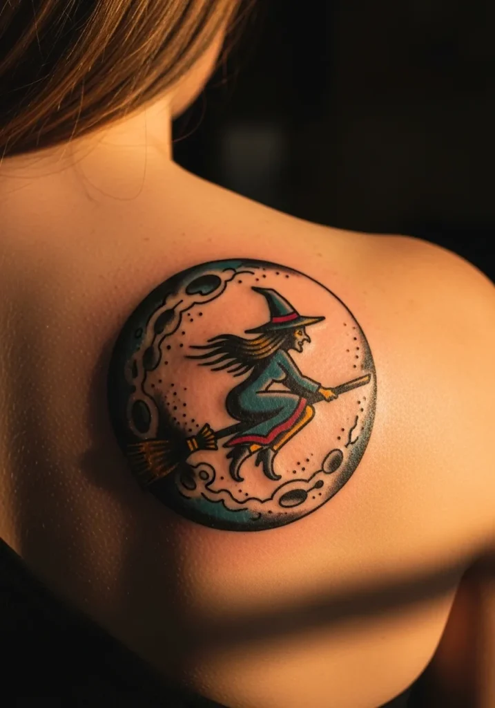This medium-sized shoulder tattoo captures a witch flying past a giant, cratered moon. The color palette mixes soft blues, oranges, and muted yellows, giving it that aged, vintage postcard feeling. The traditional shading and thick black outlines make it pop against the skin, while the round shape fits perfectly on the upper shoulder.