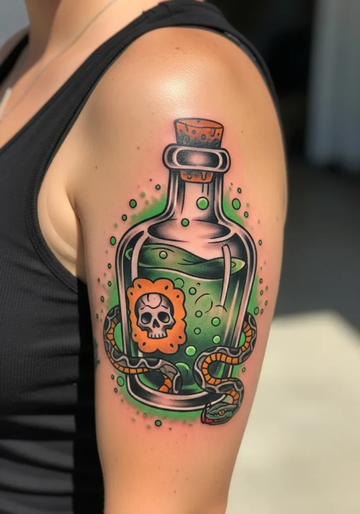 Placed on the upper arm, this large potion bottle tattoo shimmers with shades of green and orange. The bottle has a skull emblem on the front and a snake coiled around it, giving it a darkly magical vibe. The thick outlines and bold color work make it an instant standout piece.