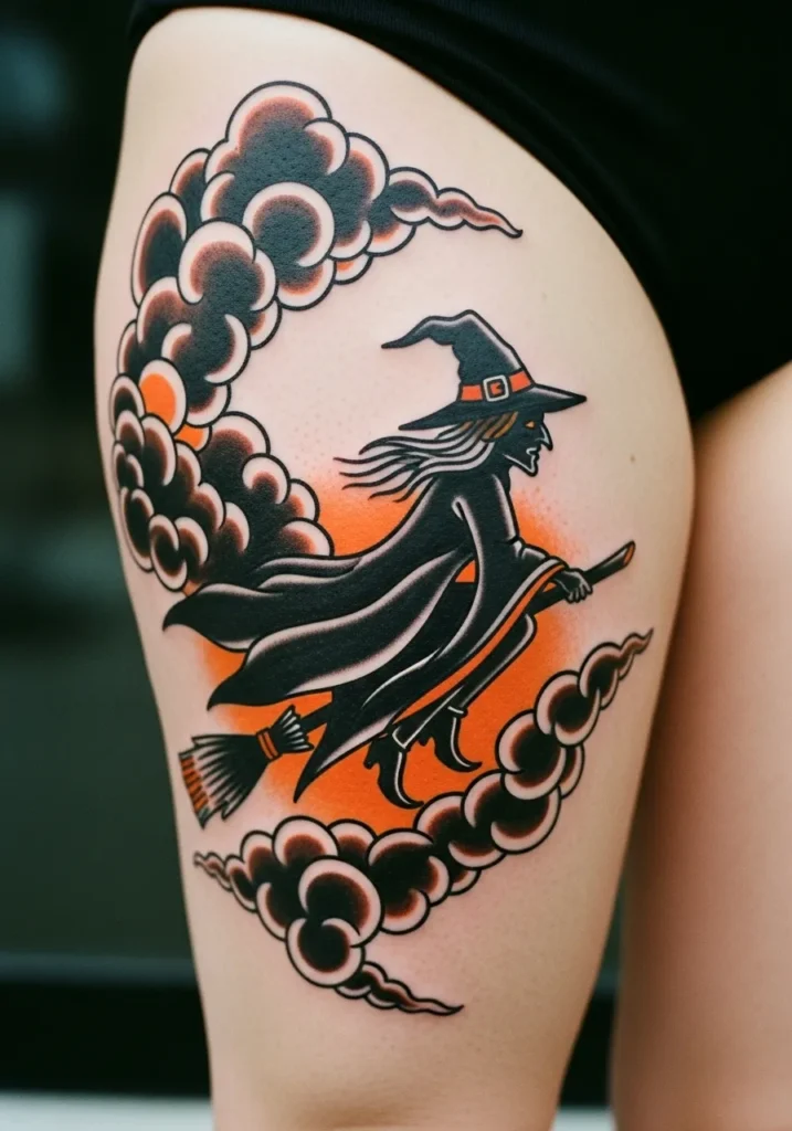 This thigh tattoo captures a classic witch silhouette riding her broom through curling black-and-orange clouds. The composition is bold and perfectly balanced, with smooth shading and glowing highlights that make the whole scene feel alive. It s large, dramatic, and unmistakably American traditional.