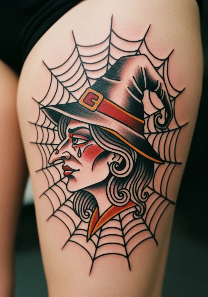 This thigh tattoo features a witch s portrait framed by a bold spider web. Her hat tilts dramatically, and a single teardrop falls down her cheek, giving her an emotional, old-school pin-up vibe. The shading and linework stay true to the traditional style, with deep blacks, soft grays, and hints of red and gold that add warmth and contrast.