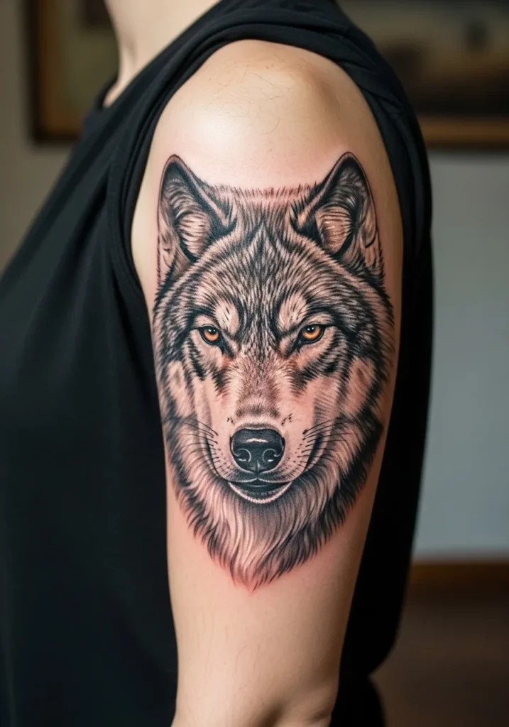 This upper arm tattoo shows a beautifully detailed wolf with sharp eyes and thick fur shading. The black and grey style gives the whole piece a strong and natural look. The medium to large size works well for the arm and lets the fur lines flow down the shoulder smoothly. The expression is calm but confident which adds to the entire mood.