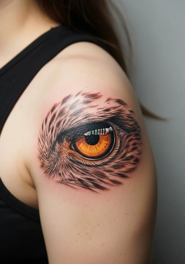 This shoulder tattoo focuses on a single owl eye with bright amber tones that glow against the darker feathers around it. The details are sharp with soft strokes that mimic real feather texture. The medium size works well on the shoulder and gives the design enough room to stay bold without overwhelming the area. The warm highlights in the iris give the eye a captivating depth.