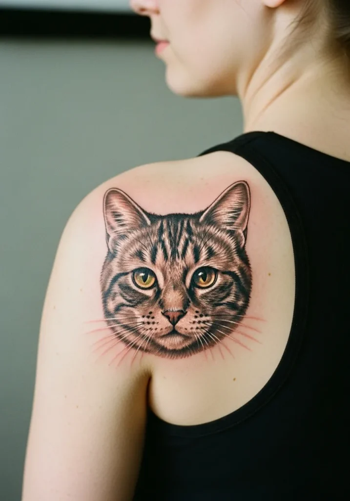 This shoulder tattoo shows an adorable tabby cat with soft stripes, warm golden eyes, and a gentle pink glow around the edges that makes the whole piece feel fresh. The size sits perfectly on the upper shoulder and gives the artist plenty of room to include delicate whiskers, tiny fur details, and those cute rounded ears. The realistic style makes the cat look like it is quietly watching with that calm kitty focus we all know and love.