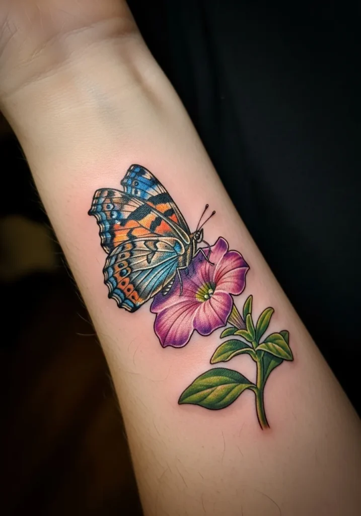 This forearm tattoo features a lovely butterfly perched on a soft pink flower. The wings have a mix of blue, orange, and black with tiny details that make the pattern look delicate and true to life. The small to medium size fits the arm perfectly and keeps the design sweet and feminine. The flower adds a pretty pop of color and gives the butterfly a natural perch.