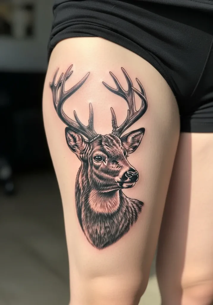 This thigh tattoo shows a regal deer with tall antlers and soft shading that gives the fur a gentle flow. The black and grey style keeps it timeless while still adding plenty of texture and detail. The size works well on the thigh since it gives the antlers room to stretch without feeling crowded. The placement feels bold yet graceful.