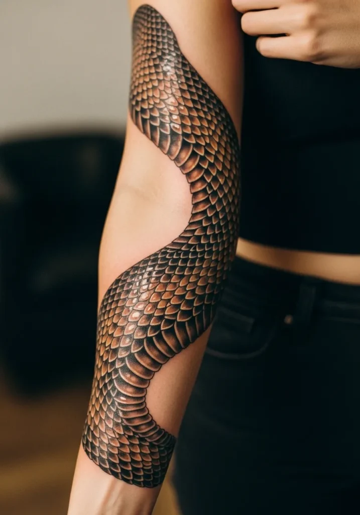 This forearm tattoo wraps around the arm with a long band of textured snake scales. The colors shift from bronze to dark brown with highlights that make each scale pop. The realistic style makes the surface look almost three dimensional. The placement is bold because it creates a wrapped effect that feels artistic and striking.
