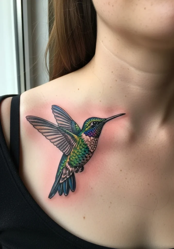 This delicate collarbone tattoo captures a hummingbird in mid flight with bright greens, blues, and touches of purple that shimmer against the skin. The style is crisp and detailed, giving each tiny feather its own moment. The medium size fits the space perfectly and frames the collarbone in a really flattering way. The wings have soft shading that adds gentle movement while the body has that glossy finish you normally see only in real hummingbirds.