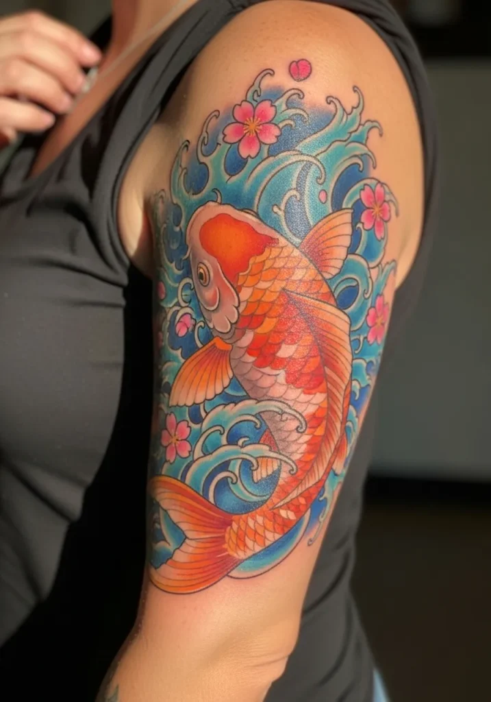 This upper arm tattoo shows a bright koi fish swimming through bold blue waves with pink cherry blossoms floating around it. The colors are rich and saturated with warm oranges and reds blended beautifully across the scales. The size fills the shoulder area in a striking way and the flowing water adds movement that wraps the arm naturally. The style mixes realism with a soft artistic flair that makes everything feel lively and full of energy.