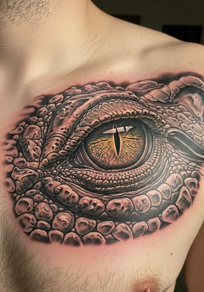 This chest tattoo showcases a dramatic reptile eye surrounded by thick scales and textured skin. The colors shift between earthy browns and greens with a glowing yellow slit pupil at the center. The large size fits the upper chest in a bold and grounded way. The shading adds dimension that makes the scales look raised and rugged.