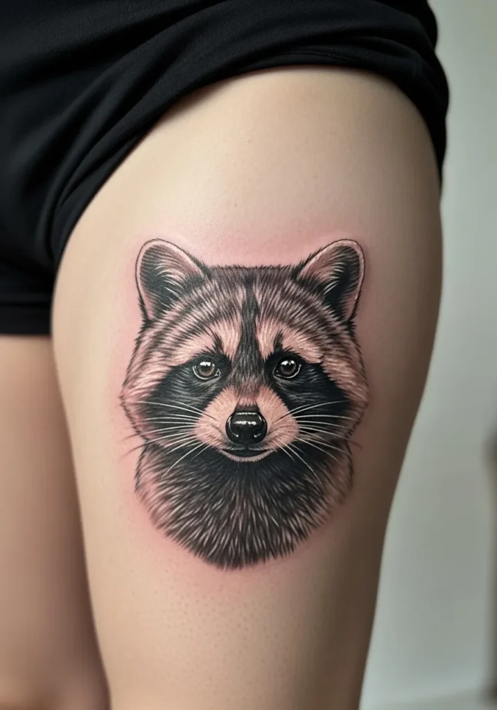 This thigh tattoo features an adorable raccoon with soft fur shading and sweet rounded eyes. The details bring out the dark mask markings and the fluffy texture around the cheeks and neck. The medium size sits nicely on the thigh and makes the raccoon feel expressive without being too large. The pink background glow adds a gentle warmth to the piece.
