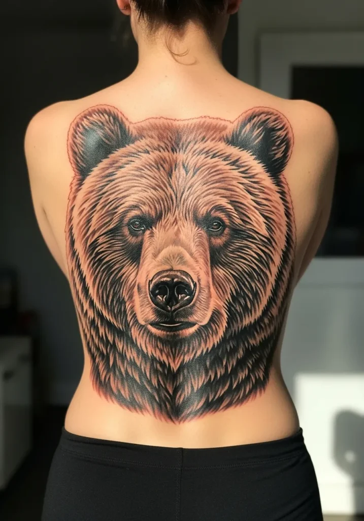 This full back tattoo features a powerful bear portrait that takes up the entire space in the most stunning way. The rich brown tones blend with deeper shadows to create a thick fur texture that feels almost touchable. The size is undeniably large, which lets every detail stand out from the soft highlights around the snout to the calm expression in the eyes. The placement gives the bear a strong and centered look that feels balanced across the back.