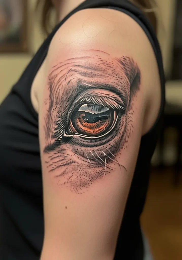 This upper arm tattoo shows a close up of an animal eye with incredible detail. The warm amber iris almost glows against the darker shading around it. You can see tiny fur textures, subtle lines, and those thin white whiskers that make the whole design look true to life. The medium size gives the eye plenty of space to shine and draws attention right to that striking stare.