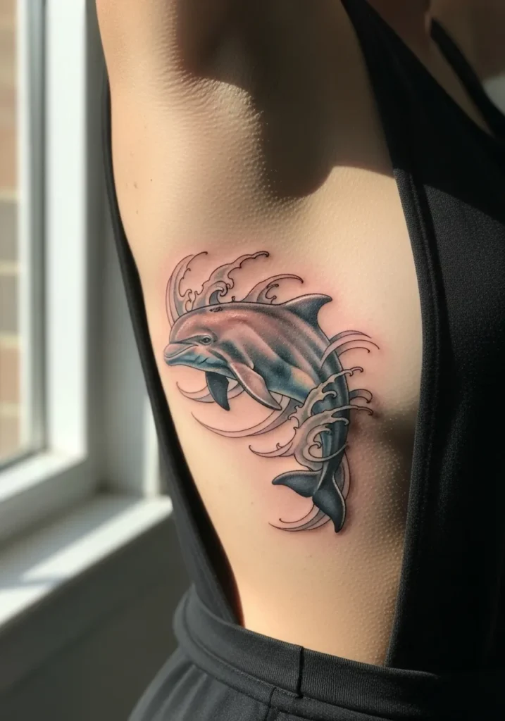 This ribcage tattoo shows a dolphin swooping through stylized waves with a smooth blend of soft blues and gentle greys. The medium size fits the curve of the body perfectly and adds a pretty flow to the design. The shading is clean and subtle while the water details give everything a nice sense of motion. The placement feels elegant because it moves naturally with the shape of the torso.